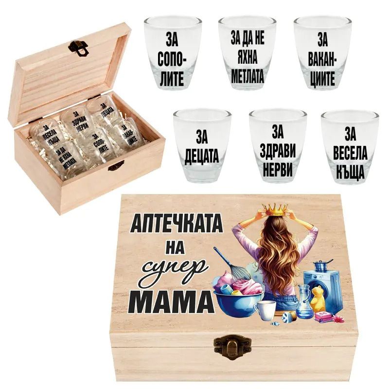 Луксозна дървена кутия с шотове/чашки - Аптечката на супер мама. На всеки шот има различен надпис с повод за пиене.