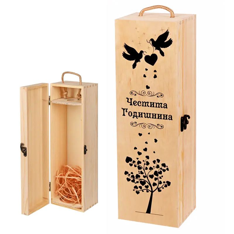 Луксозна дървена подаръчна кутия за вино - "Честита годишнина".