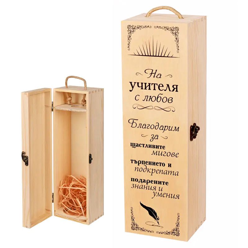 Луксозна дървена подаръчна кутия за вино - "На учителя с любов".